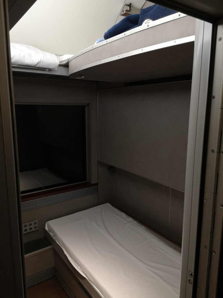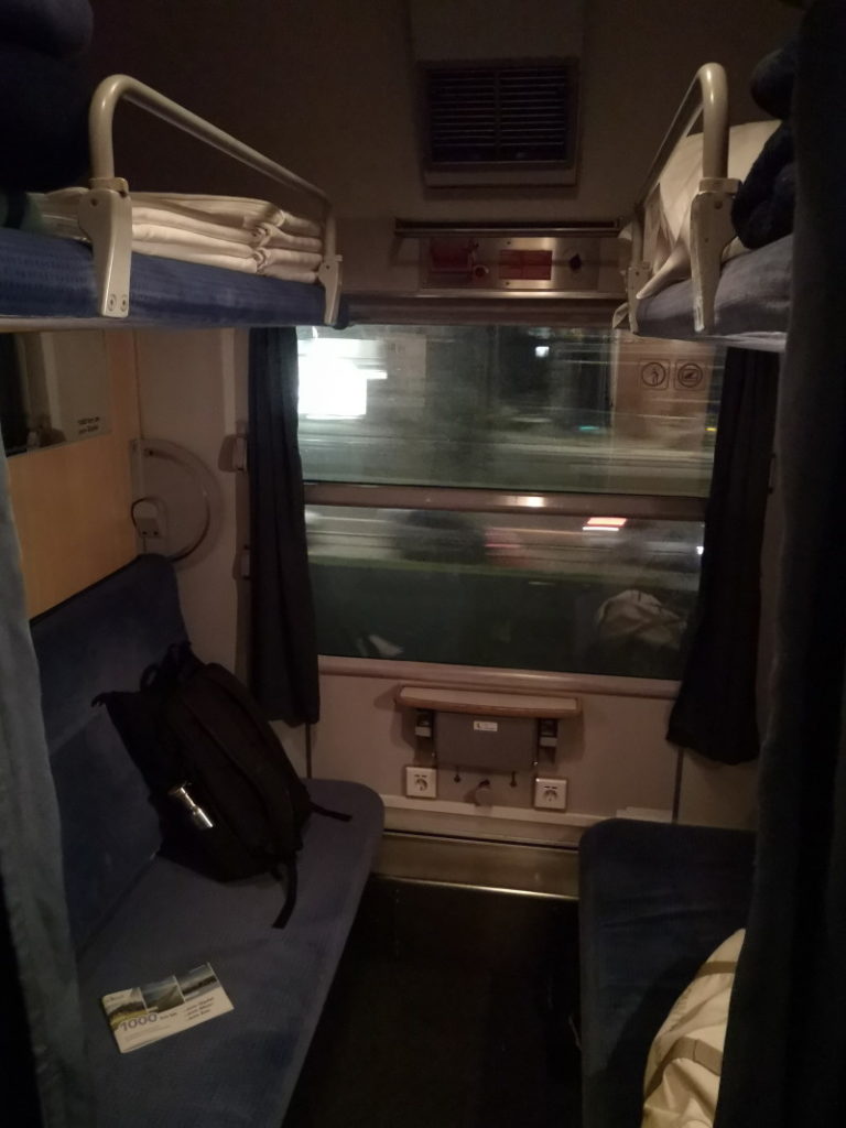 Wir haben für unsere Reise ein privates Liegewagenabteil gebucht. In dieser Nacht erhalten wir Abteil 9 im Wagen 44. Der Wagen verfügt insgesamt über 10 Liegeabteile für je sechs Personen sowie WC und Waschabteile. Beim Betreten des Abteils ist es als Sitzabteil ausgelegt. Ein Tisch, der unter der Sitzbank verstaut ist, kann flexibel aufgebaut werden. Unser Gepäck können wir sowohl unter den Sitzen als auch im Stauraum in der obersten Liegereihe verstauen. Der Umbau zum Liegeabteil ist mit wenigen Handgriffen erledigt und auch für Laien einfach durchzuführen. Bettlaken, -decken und Kissen liegen bereits parat. Das Abteil und die Ausstattung macht insgesamt einen sauberen Eindruck, auch wenn wir vor dem Frühstück noch einmal die Oberfläche des Tischs reinigen. Im Abteil existiert eine Lüftung, die eine Temperaturregulierung ermöglicht. Neben der Deckenbeleuchtung in der verschiedenen Stufen gibt es auch ein Schlaflicht für jeden Liegeplatz. Alle Abteile verfügen zudem über neue Steckdosen, die neben einer Standardsteckdose auch USB Lademöglichkeiten besitzen. Die WCs und Waschräume sind sauber und wurden auch in der Nacht noch einmal gereinigt. Allerdings wirken die sanitären Einrichtung ein wenig veraltet und die Waschbecken könnten ein wenig größer gestaltet sein.