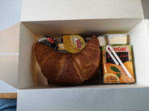 Das Frühstück wird entsprechend vor der Ankunft ins Abteil serviert. Es besteht aus verschiedenen Brotscheiben und einem Croissant sowie unterschiedlichen Aufstrichen, einem Orangensaft und Kaffee oder Tee.