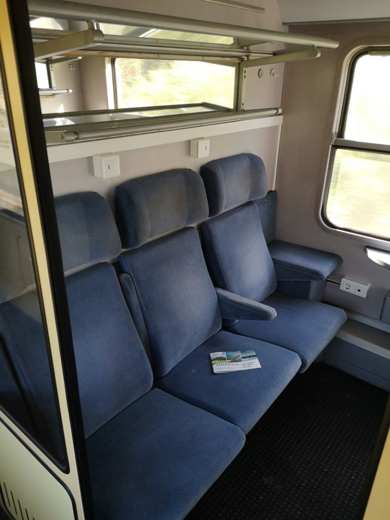 Dem Wagen und insbesondere Beschilderungen und zum Beispiel Polstern sieht man insgesamt deutlich die Historie als Liegewagen der Deutschen Bahn an.