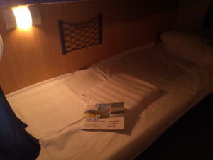 Da wir bereits zu fortgeschrittener Zeit an diesem Abend in den Zug einsteigen und in den meisten Abteilen bereits die Lichter ausgeschaltet sind, entscheiden auch wir uns dafür die Sitze schnell nach Abfahrt in Hamburg umzuklappen. Mit wenigen Handgriffen sind die sechs Betten für alle hergerichtet. Nur noch schnell den Bezug und die Decke samt Kissen auflegen und schon ist das Abteil bereit für die Nacht. Da wir zu viert im Abteil sind, wird das obere Bett als Ablagefläche genutzt. Nach dem Bettfertig machen und dem Besuch der Waschräume heißt es dann „Ab ins Bett“. Die Beleuchtung des Abteils kann in verschiedenen Stufen abgedunkelt werden. Dank Vorhängen sowohl vor den Fenstern wie auch zum Durchgang ist das Abteil relativ dunkel. Da der Vorhang leider nicht das gesamte Licht abhält, kommt der ein oder andere Lichtstrahl gerade an Bahnhöfen dann doch durch. Hier wirken eine Schlafbrille und Ohrenstöpsel Wunder.